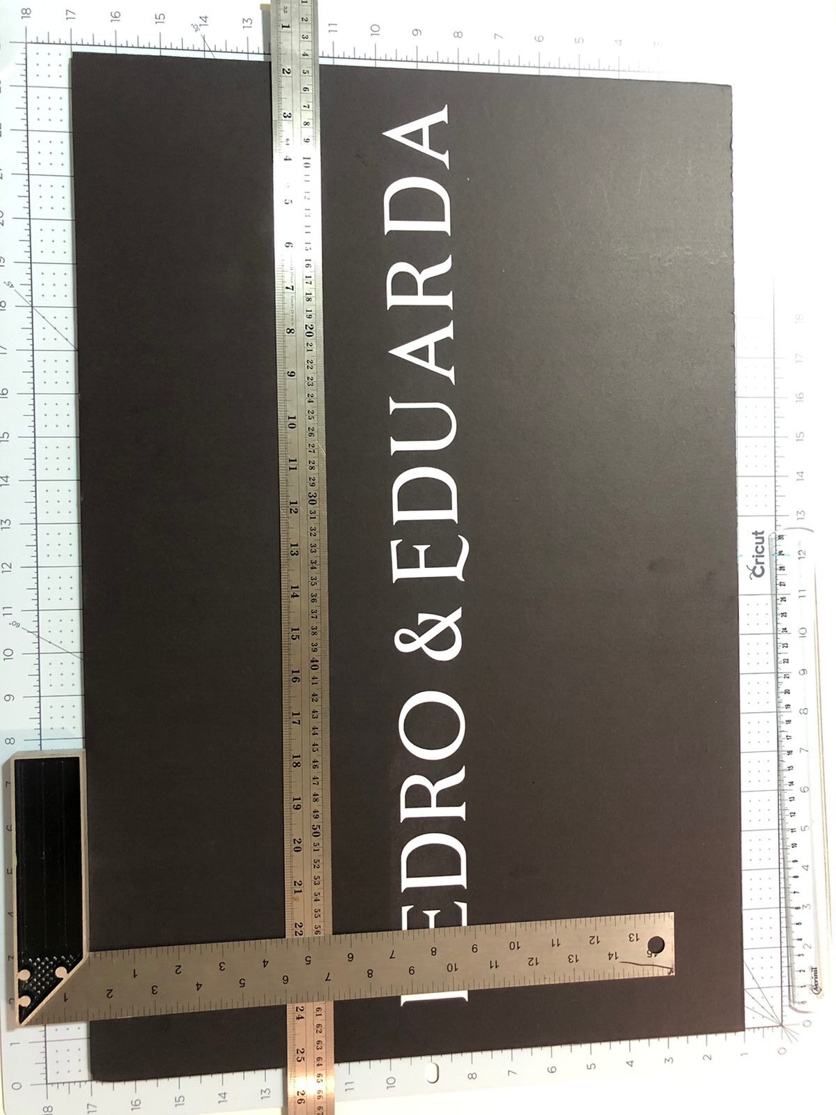 Nós colocamos a placa na base de corte da Cricut que já tinha as medidas que precisávamos para deixar a placa reta e a régua também. Foram usadas 2 réguas, uma era para deixar a escrita reta, na mesma direção; a outra era para medir onde começaria a frase.