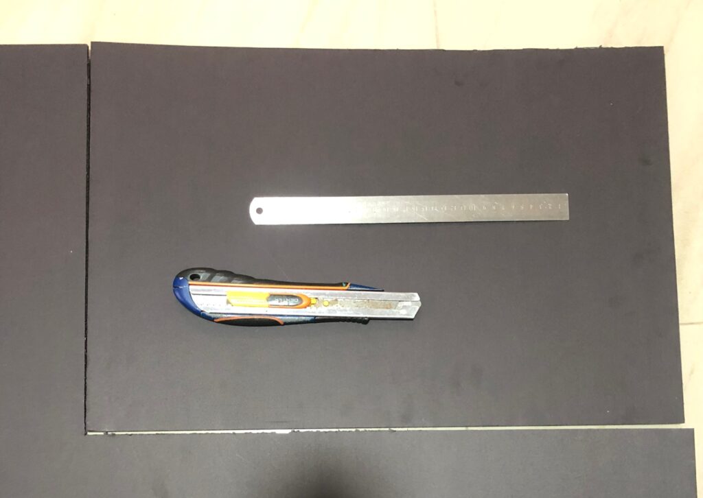 Foi cortado com uma régua para apoiar o estilete e deixar o corte bem preciso.