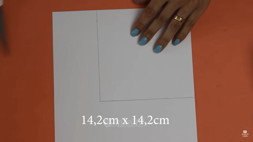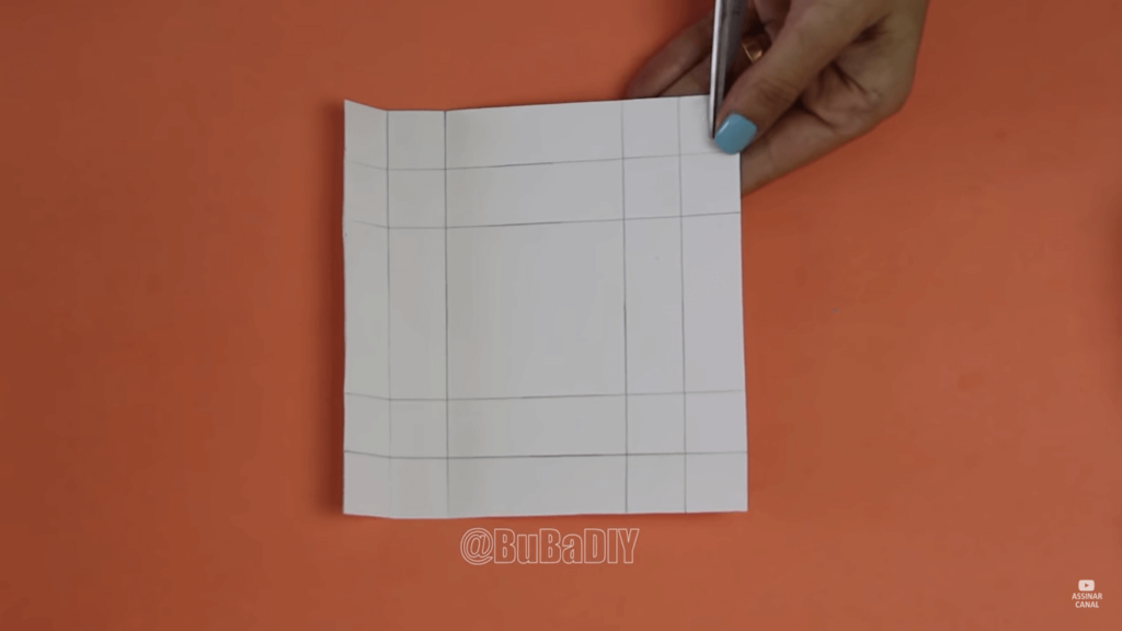 Eu te indicaria olhar esse passo no vídeo porque está bem detalhado. Mas, também deixaremos as fotos do que fazer aqui. Depois de dobrar as marcações, recorte as quatro pontas do papel.