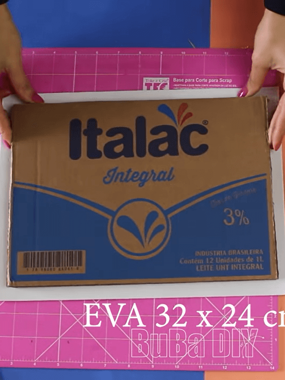 Primeiro, encapamos a base, usando um EVA com a medida 3cm maior de cada lado, ou seja, o EVA tem 24x32cm. aplicamos cola quente no papelão e depois centralizamos o EVA para colar.